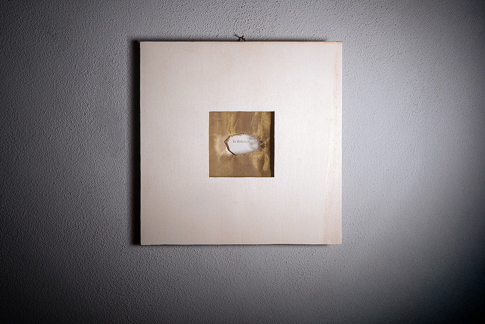 La poesia di Dacia Maraini “Ho sognato di volare” per ora non l’ho ancora scritta tutta, ma vorrei farlo. Ne ho estratto dei frammenti, poche parole. Li ho inseriti in cassette di legno e poi ho creato una barriera, in questo caso di seta, altre volte in tessuto d’ottone. Volevo lavorare sulla trasparenza, ma non ero convinta che il vetro potesse funzionare e quindi ho pensato di bucare questa specie di filtro, di membrana, come se fosse rotto da un becco. Mi dà l’idea di aprire un varco in questa cosa che è chiusa… come se fosse una nascita.